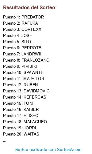 Lista de participantes: CORTEXX, DAVIDMOVIC, ELISEO, FRANLOZANO, PESCAITO, TONI, IMPARABLE, JANDRWII, JORDI, JOSE, KEFERGAS, PIRIBIKI, MAJEITOR, MALAGUEO, MIGUECHE, PERROTE, RUBEN, PREDATOR, KAISER, SITO, SPAWNTF, WAITAS, RAFUKA.
