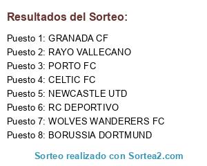 Lista de participantes: NEWCASTLE UTD, RAYO VALLECANO, CELTIC FC, RC DEPORTIVO, PORTO FC, BORUSSIA DORTMUND, WOLVES WANDERERS FC, GRANADA CF.