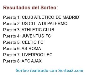 Lista de participantes: CELTIC FC, JUVENTUS FC, ATHLETIC CLUB, LIVERPOOL FC, AS ROMA, US CITTA DI PALERMO, AFC AJAX, CLUB ATLETICO DE MADRID.