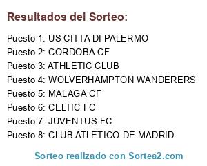 Lista de participantes: CELTIC FC, US CITTA DI PALERMO, JUVENTUS FC, ATHLETIC CLUB, MALAGA CF, CORDOBA CF, WOLVERHAMPTON WANDERERS, CLUB ATLETICO DE MADRID.
