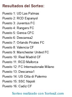 Lista de participantes: Juventus FC, Orlando Pirates FC, Manchester United FC, Genoa CFC, RCD Mallorca, US Citta di Palermo, FC Internazionale Milano, Real Madrid CF, RCD Espanyol, Rangers FC, Cadiz CF, UD Las Palmas, Valencia CF, SSC Napoli, Descansa1, Descansa2.