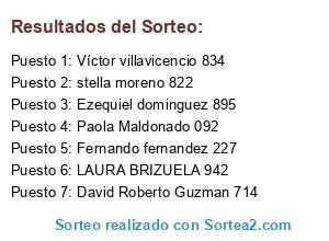 Lista de participantes: Gabriel Cuello 216, emiliano sirafi 794, mariano canto 201, florencia gaffel 130, Víctor villavicencio 834, franco guardia 519, Adriana Rodriguez 307, carina moreno 915, Alicia González 323, LAURA BRIZUELA 942, gabriel sirafi 063, Magalí Ontiveros 975, stella moreno 822, Maxi guevara 960, Valeria Muñoz 175, franco sirafi 541, martin perez 821, Ariel gutierrez 583, Ezequiel dominguez 895, jonatana castro 347, Romina jofre 115, mariela roca 254, Cintia chirino 902, Darciel Villa, 032, David Roberto Guzman 714, Paola Maldonado 092, Fernando fernandez 227, Cristian Zarate 234, Andres barbano 668, Diego Pallares 612.
