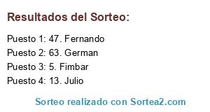 Lista de participantes: 1. José María, 2.Rommel, 3.L Ruiz, 4.guillermo, 5. Fimbar, 6. José Maria, 7. Pedro, 8. Coco, 9.guillermo, 10. Sergio, 11.Tavi, 12. Carlos, 13. Julio, 14. Coco, 15. Pedro, 16. José María, 17. Antonio, 18. Tavi, 19. Johnnathan, 20. Julio, 21. Pedro, 22. Fimbar, 23. Johnnathan, 24. Rommel, 25. Sergio, 26. Juanjo, 27.guillermo, 28. Carlos, 29. Fimbar, 30. Coco, 31.Sergio, 32 Carlos, 33. Antonio, 34. Omar, 35 Tavi, 36. Pozu, 37 Tavi, 38. Roberto, 39. Omar, 40. Pedro, 41. Juanjo, 42. Coco, 43. Omar, 44. L Ruiz, 45. Rommel, 46. Pozu, 47. Fernando, 48. Fernando, 49. Juanjo, 50. Fernando, 51. German, 52. Pozu, 53 Coco, 54. Roberto, 55. Julio, 56. German, 57. German, 58 Tavi, 59. Johnnathan, 60. Pozu, 61. German, 62. L Ruiz, 63. German, 64. Pozu, 65. Antonio, 66. Pedro, 67. Roberto, 68. Ismael, 69. Ismael, 70. Ismael.
