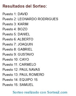 Lista de participantes: LEONARDO RODRIGUES, CARMELO, BOZO, DANIEL, CAYO, JOAQUIN, ALBERTO, GABRIEL, GUSTAVO, PAUL NAVAS, PAUL ROMERO, SAMUEL, DAVID, KARIM, EQUIPO 15.