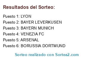 Lista de participantes: BORUSSIA DORTMUND, BAYER LEVERKUSEN, BAYERN MUNICH, VENEZIA FC, LYON, ARSENAL.