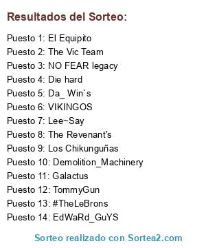 Lista de participantes: Demolition_Machinery, #TheLeBrons, Da_ Win`s, Die hard, EdWaRd_GuYS, El Equipito, Galactus, Lee~Say, Los Chikunguñas, NO FEAR legacy, The Revenant's, The Vic Team, TommyGun, VIKINGOS.