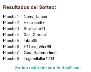 Lista de participantes: - Sevillaste11, - F1Tors_Vifer99, - Gas_Hammertime, - Xss_Xtreme1, - Nony_Taleee, - Legendkiller1234, - Tikilo69, - Excelsior67.