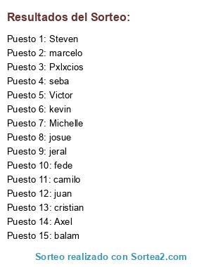 Lista de participantes: Michelle (5), Axel (5), Steven (2), camilo (2), Victor (6), Pxlxcios (6), kevin, josue (4), fede (3), cristian, marcelo (6), balam, jeral, juan, seba (6)..