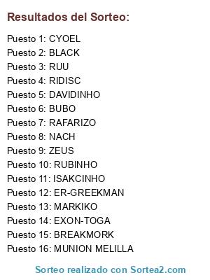 Lista de participantes: BREAKMORK, RUBINHO, NACH, ER-GREEKMAN, RUU, MUNION MELILLA, BUBO, RIDISC, DAVIDINHO, BLACK, ISAKCINHO, CYOEL, ZEUS, EXON-TOGA, MARKIKO, RAFARIZO.