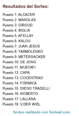 Lista de participantes: ROBERTO, ASENJO, METERSACKER, MANOLAS, COCENTRAO, V,DER WIEL, MUSTAFI, JUAN JESUS, CAPA, BIGLIA, DE JONG, FÓRMICA, AFELLAY, GIROUD, YARMOLENKO, KALOU, ALCACER, D.CAPEL, DIEGO TRADELLI, FALCAO, LALLANA.