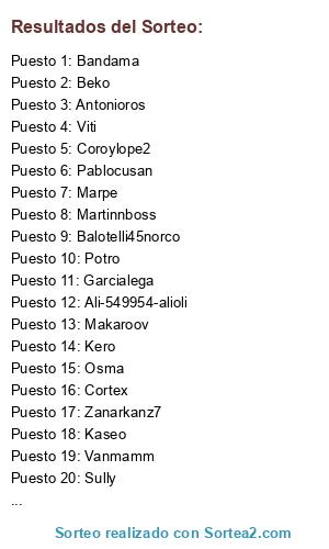 Lista de participantes: Exon, Garcialega, Marpe, Makaroov, Potro, Martinnboss, Pable55, Pablocusan, Osma, Sully, Vanmamm, Zanarkanz7, Beko, David Fenix, Kero, Viti, Albo, Ali-549954-alioli, Kaseo, Antonioros, Balotelli45norco, Bandama, Coroylope2, Cortex.