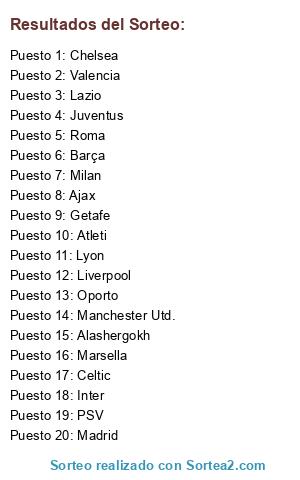 Lista de participantes: Madrid, Lazio, Roma, Manchester Utd., Juventus, Milan, Liverpool, Chelsea, Alashergokh, PSV, Oporto, Ajax, Celtic, Getafe, Barça, Lyon, Marsella, Atleti, Valencia, Inter.