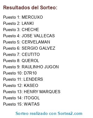 Lista de participantes: CERVELAMAN, CEUTITO, CHECHE, D7R10, HENRY MARQUES, ITOGOL, JOSE VALLECAS, KASEO, LANKI, LENDERS, MERCUXO, QUEROL, RAULINHO JUGON, SERGIO GALVEZ, WAITAS.