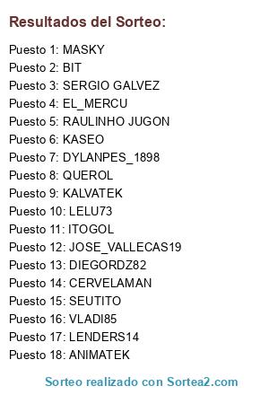 Lista de participantes: KASEO, QUEROL, CERVELAMAN, SERGIO GALVEZ, EL_MERCU, BIT, ITOGOL, RAULINHO JUGON, ANIMATEK, LELU73, VLADI85, DYLANPES_1898, DIEGORDZ82, JOSE_VALLECAS19, MASKY, KALVATEK, LENDERS14, SEUTITO.