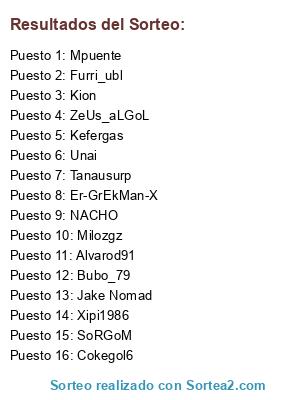 Lista de participantes: NACHO, Furri_ubl, Cokegol6, Milozgz, Kion, Xipi1986, Alvarod91, Tanausurp, Kefergas, ZeUs_aLGoL, Unai, Bubo_79, Mpuente, Er-GrEkMan-X, SoRGoM, Jake Nomad.