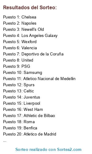 Lista de participantes: Napoles, Spurs, Levante, Roma, Dortmund, Real Madrid, West Ham, Wexford, PSV, Bayern Munich, Chelsea, Alaves, Rangers, Juventus, PSG, Benfica, Deportivo de la Coruña, Sevilla, Liverpool, Atletico de Madrid, FC Barcelona, Atletico Nacional de Medellin, Newell's Old, Valencia, Samsumg, Huracan, Los Angeles Galaxy, Athletic de Bilbao, Torino, Cordoba, Celtic, United.