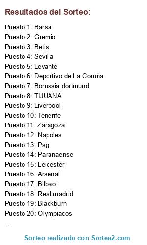 Lista de participantes: Roma, Bilbao, TIJUANA, Juve, Malaga, Paranaense, Olympiacos, Napoles, City, Liverpool, United, Gerona, Blackburn, Arsenal, Celtic, Borussia dortmund, St pauli, Barsa, Betis, Levante, Aek, Atlético de Madrid, Alwedah, Deportivo de La Coruña, Chelsea, Zaragoza, Spurs, Psg, Villarreal, Leverkusen, Gremio, Español, Panathinaikos, Leicester, Newyork, Cádiz, Tenerife, Sevilla, Real madrid, Valencia.