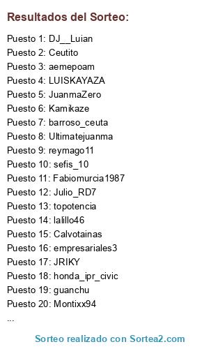 Lista de participantes: Luisesss, Karlitros_vk88, Breakmork, Ruben1979, Nmori, MR_Lois_MBO, Elmanu_vk, Majeitor, Pedro_vk_21, Mortiis999, Cazorliyaaa_pes8, Nachettte.