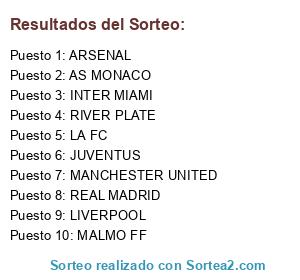 Lista de participantes: ARSENAL, INTER MIAMI, REAL MADRID, LIVERPOOL, JUVENTUS, MANCHESTER UNITED, RIVER PLATE, AS MONACO, LA FC, MALMO FF.