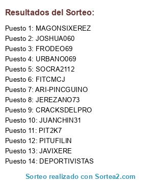 Lista de participantes: SOCRA2112, PIT2K7, FRODEO69, PITUFILIN, DEPORTIVISTAS, CRACKSDELPRO, JAVIXERE, URBANO069, JEREZANO73, ARI-PINCGUINO, JUANCHIN31, MAGONSIXEREZ, JOSHUA060, FITCMCJ.