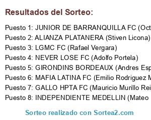 Lista de participantes: JUNIOR DE BARRANQUILLA FC (Octavio Marin), GIRONDINS BORDEAUX (Andres Espitia), NEVER LOSE FC (Adolfo Portela), GALLO HPTA FC (Mauricio Murillo Reina), ALIANZA PLATANERA (Stiven Licona), INDEPENDIENTE MEDELLIN (Mateo Patiño), MAFIA LATINA FC (Emilio Rodriguez Morales), LGMC FC (Rafael Vergara).