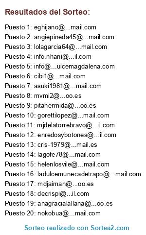 Lista de participantes: @africatrujillo, @alexia.porqueras, @amayabm, @amorydulceseventos, anabhdez@hotmai, l.com, @anabuhforyou, @anagracialallana, @angiepineda45, @aranchabaro, @asuki1981, @babelita29, @chelo347, @cibi1, @clapagrava, @clara-collado, @cris-1979, @cristinatorres7306, @crodrigoq, @decrispi, @dorrca, @eghijano, @elehazara, @elhadadelosdulces, @encandyla, @enredosybotones, @gorettilopez, @granu77, @helenlosvile, @helgap, @info.nhani, @info, @iportas2, @isabel.soto, @joseabas, @kaenae, @kilikuaki, @ladulcemunecadetrapo, @lagofe78, @lecoquetteinma, @lidiasanchez85, @locurasobretela, @lolagarcia.escobar, @lolagarcia64, @lolagarciae, @lorena.felices, @losdulcesdevictoria, @marga.moreno.f, @mariaestear, @maribelhigueraslo, @marinaspaloma, @martuchi2001, @maryjj27, @mdjaiman, @mjdelatorrebravo, @montasugar, @mvmi2, @nesitina, @noamcardaba, @noeliaherranz, @nokobua, @nuriaprimo, @olga.cab, @perezbediam, @pitahermida, @reinaamidala10, @rlleida, @rociorodrigolopez, @sljorrin, @tanitllopart, @xra357, @zueco.rojo.