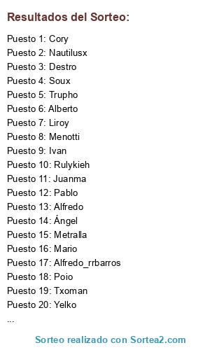 Lista de participantes: Yepes, Metralla, Destro, Liroy, Ángel, Alfredo_rrbarros, Muyayo, Sergio, Mario, Jordi, Txoman, Alberto, Geri, Bollo, Rulykieh, Ivan, Xevi, Poio, Pablo, Moeche, Fran, Alfredo, Josep, Alkapone, Juanma, Nautilusx, Yelko, Mitch, Alex, Montoro, Menotti, Soux, Garradofans, Trupho, Martikenobi, Cory.