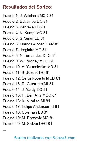 Lista de participantes: R. Guerreiro MI 81, N.Fernandez DFC 81, R.Rodriguez LI 81, Marcos Alonso CAR 81, N. Semedo LD 81, S.Aurier LD 81, De Marcos LD 81, Coleman LD 81, Sergi Roberto MCD 81, J. Wilshere MCD 81, Paulinho MCD 81, B. Schweinsteiger MCD 81, Jorginho MC 81, M. Brozović MC 81, Benteke DC 81, M. Götze MC 81, W. Zaha MD 81, A. Yarmolenko MD 81, K. Mirallas MI 81, Williams ED 81, Felipe Anderson EI 81, R. Barkley MCO 81, W. Rooney MCO 81, H. Ben Arfa MCO 81, S. Jovetić DC 81, J. Vardy DC 81, Fernando Torres DC 81, Rafinha MC 81, Bakambu DC 81, W. Ben Yedder DC 81, K. Kampl MC 81, Rudy MC 81, Perotti EI 81, Weigl MCD 81, M. Sakho DFC 81, J. Corona ED 81.