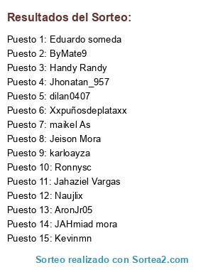 Lista de participantes: Naujlix, ByMate9, Xxpuñosdeplataxx, karloayza, dilan0407, Eduardo someda, JAHmiad mora, Jeison Mora, Jhonatan_957, Kevinmn, maikel As, Ronnysc, Handy Randy, AronJr05, Jahaziel Vargas.