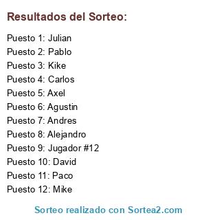 Lista de participantes: Mike, Axel, Andres, Alejandro, Pablo, Kike, David, Julian, Carlos, Paco, Agustin, Jugador #12.