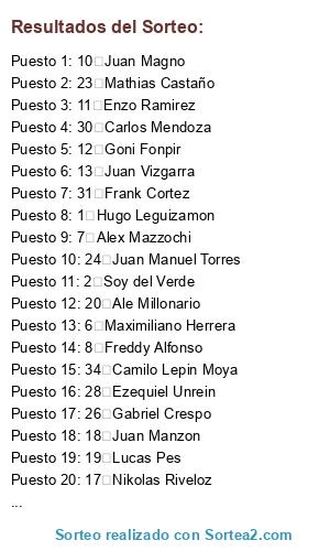 Lista de participantes: 1 Hugo Leguizamon, 2 Soy del Verde, 3 Victor Hugo Flores, 4 Pocho Sabalero, 5 Marcos Perez, 6 Maximiliano Herrera, 7 Alex Mazzochi, 8 Freddy Alfonso, 9 Leandro Cabrera, 10 Juan Magno, 11 Enzo Ramirez, 12 Goni Fonpir, 13 Juan Vizgarra, 14 Milciades Portillo, 15 Fernando Gallo, 16 Chino Salas, 17 Nikolas Riveloz, 18 Juan Manzon, 19 Lucas Pes, 20 Ale Millonario, 21 Alex Barrera, 22 Claudio Medina, 23 Mathias Castaño, 24 Juan Manuel Torres, 25 Mathias Zanoni, 26 Gabriel Crespo, 27 Juan Carlos bq, 28 Ezequiel Unrein, 29 Alex Orozco, 30 Carlos Mendoza, 31 Frank Cortez, 32 Jose Romano, 33 Sebastian Sotelo akd, 34 Camilo Lepin Moya, 35 Huguito Flores Jimenez.