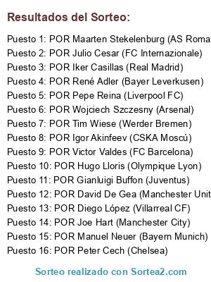 Lista de participantes: POR Joe Hart (Manchester City), POR René Adler (Bayer Leverkusen), POR Diego López (Villarreal CF), POR Gianluigi Buffon (Juventus), POR Hugo Lloris (Olympique Lyon), POR Maarten Stekelenburg (AS Roma), POR Julio Cesar (FC Internazionale), POR Igor Akinfeev (CSKA Moscú), POR Wojciech Szczesny (Arsenal), POR Iker Casillas (Real Madrid), POR Victor Valdes (FC Barcelona), POR Manuel Neuer (Bayern Munich), POR Pepe Reina (Liverpool FC), POR David De Gea (Manchester United), POR Peter Cech (Chelsea), POR Tim Wiese (Werder Bremen).