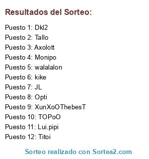 Lista de participantes: Dkl2, JL, Monipo, Lui.pipi, Opti, Titoi, XunXoOThebesT, walalalon, kike, Axolott, Tallo, TOPoO.