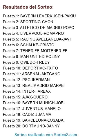 Lista de participantes: LIVERPOOL-ROMAPRO, ATLETICO DE MADRID-POPO, DEPORTIVO-TXITO, TENERIFE-MOITENERIFE, PSG-IKERMAN, REAL MADRID-MARPE, BAYERN LEVERKUSEN-PAKIU, BARCELONA-LOSADA, JUVENTUS-MANELO, OVIEDO-FREDY, RACING AVELLANEDA-JAVI, AJAX-QUERO, DORTMUND-DANNY, MAN UNITED-POLINY, SCHALKE-CRISTO, ARSENAL-AKTGANO, SPORTING-CHONI, BAYERN MUNICH-JOEL, CADIZ-JUANMA, INTER-FARBAX.