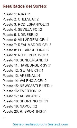 Lista de participantes: AC MILAN 2, AJAX 1, ARSENAL 4, AS ROMA 1, ATLETICO MADRID 1, BOCA JUNIORS 3, CHELSEA 2, EVERTON 2, FC BARCELONA 2, FC BAYERN 3, FC PORTO 3, FIORENTINA 3, GETAFE CF 1, HAMBURGER SV 1, LIVERPOOL 2, MALAGA CF 2, NAPOLI 2, NEWCASTLE UTD 1, PANATHINAIKOS 3, R. SPORTING 1, RC DEPORTIVO 1, RCD ESPANYOL 3, REAL MADRID CF 3, REAL SOCIEDAD 3, SAMPDORIA 2, SEVILLA FC 2, SPORTING CP 1, SPURS 2, SUNDERLAND 3, UD LAS PALMAS 1, UDINESE 2, VALENCIA CF 2, VFL WOLFSBURG 3, VILLARREAL CF 1.
