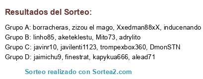 Lista de participantes: alead71, kapykua666, javilenti1123, inducenando, finestrat, adrylito, linho85, aketeklestu, borracheras, javinr10, DmonSTN, jaimichu9, trompexbox360, zizou el mago, Xxedman88xX, Mito73.