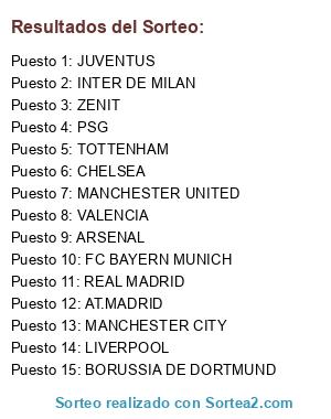Lista de participantes: AT.MADRID, BORUSSIA DE DORTMUND, FC BAYERN MUNICH, LIVERPOOL, TOTTENHAM, MANCHESTER CITY, ARSENAL, JUVENTUS, PSG, VALENCIA, INTER DE MILAN, ZENIT, REAL MADRID, MANCHESTER UNITED, CHELSEA.