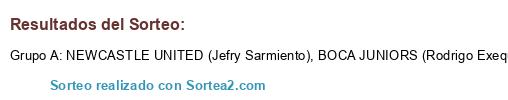 Lista de participantes: NEWCASTLE UNITED (Jefry Sarmiento), BOCA JUNIORS (Rodrigo Exequiel).
