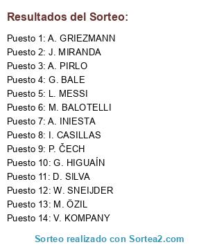 Lista de participantes: P. ČECH, I. CASILLAS, J. MIRANDA, V. KOMPANY, A. PIRLO, W. SNEIJDER, A. INIESTA, D. SILVA, M. ÖZIL, L. MESSI, G. BALE, G. HIGUAÍN, A. GRIEZMANN, M. BALOTELLI.