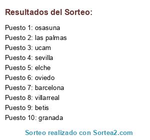 Lista de participantes: sevilla, betis, barcelona, ucam, oviedo, elche, las palmas, villarreal, granada, osasuna.