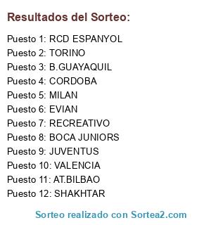 Lista de participantes: JUVENTUS, RECREATIVO, SHAKHTAR, RCD ESPANYOL, MILAN, EVIAN, AT.BILBAO, BOCA JUNIORS, TORINO, VALENCIA, B.GUAYAQUIL, CORDOBA.