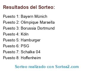 Lista de participantes: Borussia Dortmund, Schalke 04, Hoffenheim, Köln, Hamburger, Bayern Münich, Olimpique Marsella, PSG.