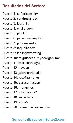 Lista de participantes: mandalataidai, eufforiajewelry, yeikita14, josefrancisco.garrido, bijouxmarie76, jalonsoartstudio, conchiglesiass, eltallerdeviri, feelingmysewing, rafisisi, puponelandia, maremel_complementos, fatimamartinezespinar, mariabelenmomblona, myprincess_myhooligan_me, uvvvve, willysflock, sarasaritasapp, shycheeks, anna5bm (3 participaciones), nosinmiagenda, olipope44, pyscys80, josefinamaryu, marynines, ulirub, sandruski_uski, elenadevenus, mellamannayla, albitafeer, yashminasilva, marialaque1, rcasr11, palaciosadiego68, noedashh, raquelhoney, mariapilar.lopezgar.3, juliamarcos2, laura_fit (7 participaciones), gus_pm9, ursulfr, _zuzuzuz, anasanchezpolo, jahullu, anadiazg_25, marinafs14.