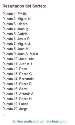 Lista de participantes: Andres, Juan Ig, Pedro G, Pedro R, Pedro H, Gabriel, Pepe, Antonio M, Antonio A, Isidoro, Lucas, Fernando, Juan A. L, Juan A. Marin, Ismael, Jesus R, Miguel N, Miguel J., Juan M., Emilio, Juan Luis, Jaime, Salva, Jorge.