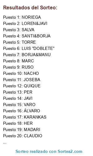 Lista de participantes: LUIS "DOBLETE", HER, NORIEGA, VARO, JAVI, NACHO, TORRE, SALVA, KARANKAS, QUIQUE, MADARI, SANTI&BORJA, HEREDIA, PER, ÁLVARO, CLAUDIO, JOSEBA, BORJA&MANU, GOITIA, RUSO, LOREN&JAVI, MARC, EDU, DIEGO "WENGER".
