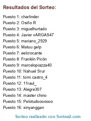 Lista de participantes: 11raul_, mariano_2929, Nahuel Srur, xinyanggan, master chino, eelcrocante, charlinder, Osiño R, tomi castro_4, Matuu gelp, marcelopiazza40, Alegre307, Anderson Cortecia, Gaston Benci, Ulises_82.