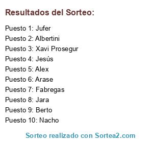 Lista de participantes: Fabregas, Arase, Alex, Berto, Xavi Prosegur, Jara, Jesús, Albertini, Nacho, Jufer.