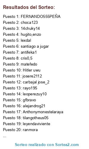 Lista de participantes: emi yema, rodrysc8, matias_210, el pitre, yealuis, pertileone, tilangotheus05, matefedo, cristiantitoaraya, Anthonymonestelaraya, moreno espuna, KING DVNNII, rayo195, DiegoSalDu, leoperezuy10, bastian yañez10, ruslan andrey ch, francoxxl, Zidane10_98, maik gaucho, juanca04, ronan arevalo, traperman, alejandrog21, edman palenque, gfbravo, vergoten, kenlly 10, Djan Andrey, lexdal, Hitler uwu, pablo arias sandi, FERNANDO555PEÑA, FC TARGARYEN, hugito,enzo, 14chuky14, carbajal jose_2, creador de futbol, ranmora, albert ibarra, anyelotty, leyendaviviente, el mono0212, myking guzman, antifeka1, cristofer yañez, cris0,5, kunparatufa, antunez11, Crismikah, josemaldonado_1, Walberto Cabezas, Ralphrio, josere2112, gonza14_4, L Tello, zednanref, juan miguel 18, ezequiel quintana, patocarp, academia44, arley ramirez, ramv0811, Ferdinand97_8, rebeldia, Bjcssb21, Nacional y Real, marc sobremarte, nicomeneguzzi, colocho034, joel26cr_1, JoSanchez06, mario jose lopez duartes, choca123, Joseph.Guardiola., santiago a jugar.