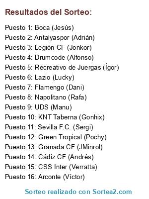 Lista de participantes: KNT Taberna (Gonhix), Napolitano (Rafa), Sevilla F.C. (Sergi), Lazio (Lucky), Green Tropical (Pochy), Drumcode (Alfonso), Recreativo de Juergas (Ígor), Cádiz CF (Andrés), Legión CF (Jonkor), Granada CF (JMinrol), CSS Inter (Verratta), Arconte (Víctor), UDS (Manu), Boca (Jesús), Flamengo (Dani), Antalyaspor (Adrián).