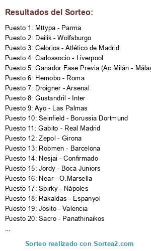 Lista de participantes: Rakaldas - Espanyol, Xarnez - Zaragoza, Draxter - Manchester United, Seinfield - Borussia Dortmund, Xtian - Palermo, Zepol - Girona, Sacro - Panathinaikos, Nesjai - Confirmado, Hemobo - Roma, Mttypa - Parma, Celorios - Atlético de Madrid, Doc amor - Alcorcón, Gabito - Real Madrid, KloN - Getafe, Gustandril - Inter, Bart - PSG, Primito - Hercules, Robmen - Barcelona, Ayo - Las Palmas, Josito - Valencia, Marcos - Stuttgart, Asier - Osasuna, Droigner - Arsenal, Carlossocio - Liverpool, Jordy - Boca Juniors, Deilik - Wolfsburgo, Jose - Bayern Munich, Sukurpim - Real Sociedad, Spirky - Nápoles, Lerida - Aston Villa, Near - O.Marsella, Ganador Fase Previa (Ac Milán - Málaga).